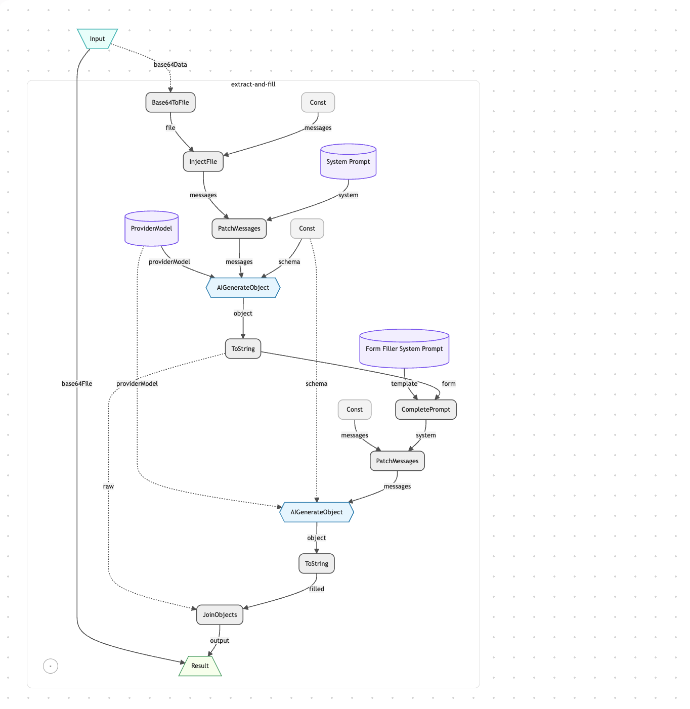 The Document Fill app registers two Reaktors. The extract-and-fill Reaktor is the full pipeline: the uploaded base64 file enters aktorBase64ToFile, gets injected into the message history via aktorInjectFile, and flows into aktorAIGenerateObject with a system prompt and the DocumentExtractionSchema for field extraction. Company knowledge is retrieved from AgentDB and injected alongside the extraction result into a fill prompt via aktorCompletePrompt, then passed to a second aktorAIGenerateObject call that populates ai_filled_value fields. Finally, aktorJoinObjects combines the raw and filled outputs into a single response. The doc-parsing Reaktor is a simpler variant that performs only the extraction phase — useful for cases where auto-fill isn't needed.