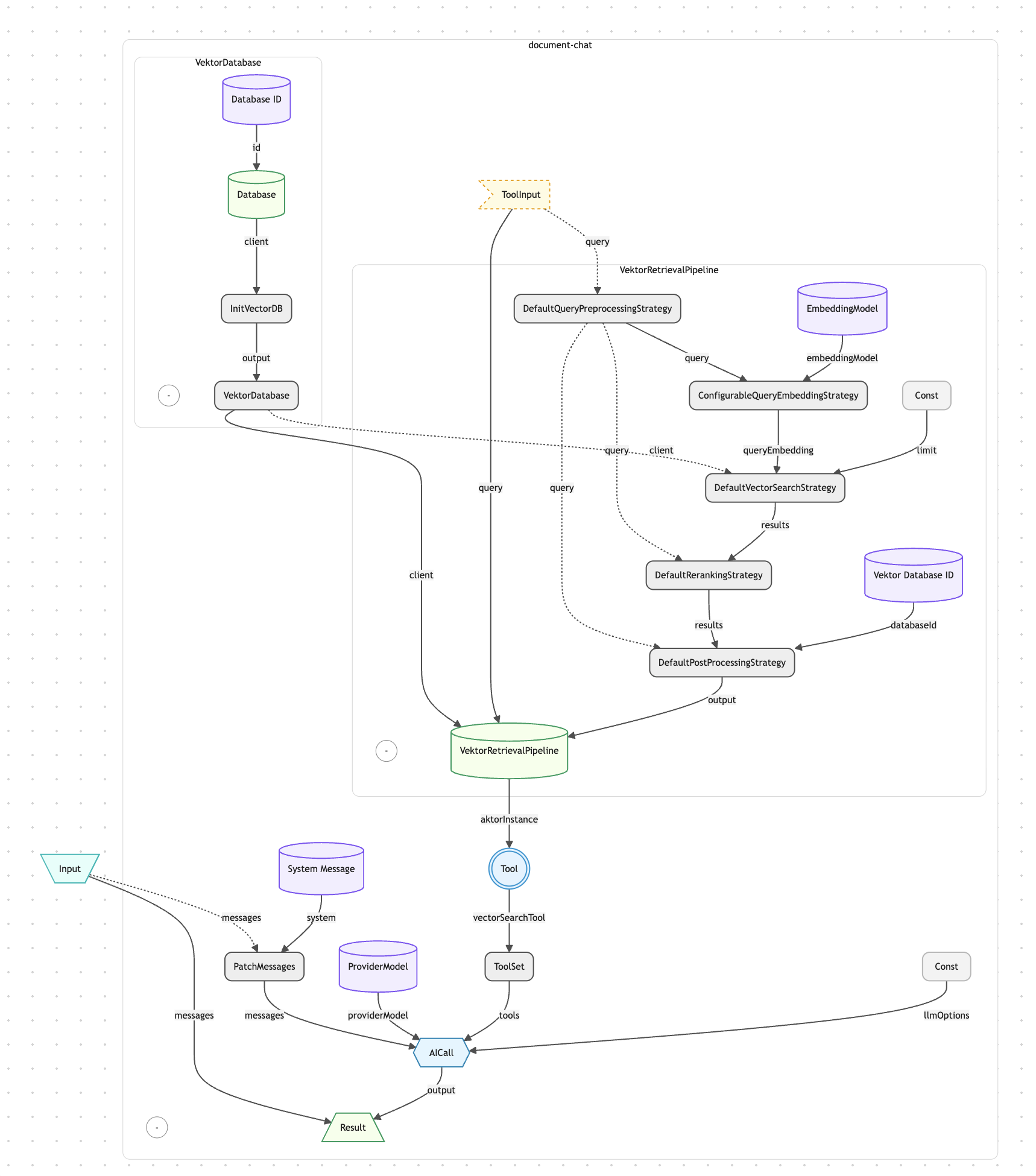 Embedding Pipeline — aktorVektorEmbeddingPipeline handles the full ingestion flow: content parsing (e.g. PDF via @operaide/document), text chunking with configurable overlap, embedding generation (OpenAI text-embedding-3-small by default), and batch storage. A custom aktorBase64ToFile converts uploaded base64 data URLs into proper File objects before they enter the pipeline.