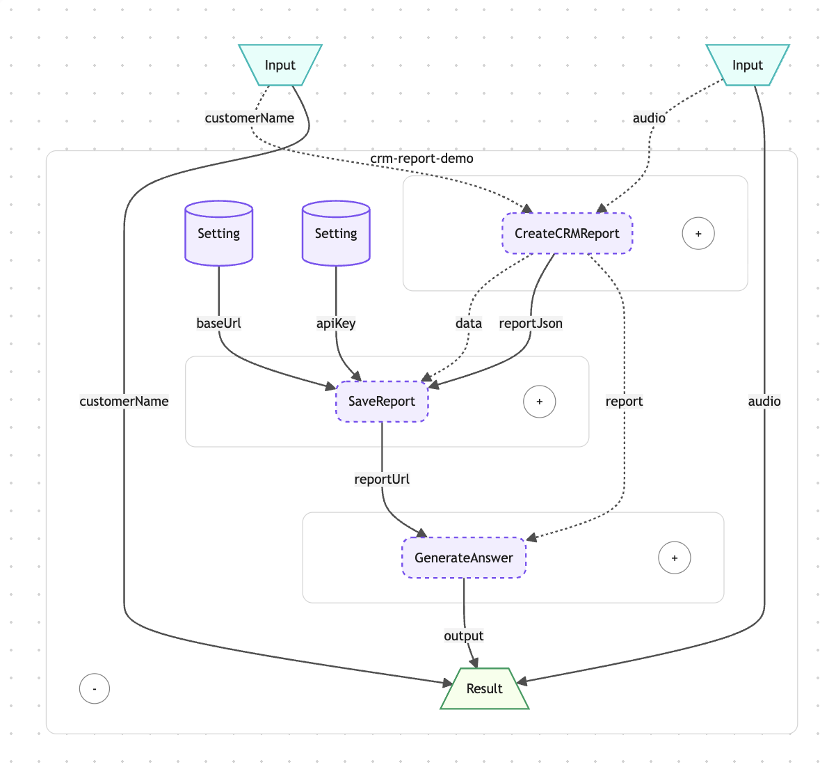 The CRM Report Reaktor follows a funnel pattern: one wide input (raw audio) progressively narrows into structured, validated output (ERP entry). The audio enters aktorSpeechToText, producing a transcript that fans out into five parallel LLM branches — summary, TODOs, subject, start date, and end date. These branches have no mutual dependencies, so the framework executes them simultaneously. Once all five resolve, aktorCreateReport assembles them into a single JSON payload, formatting text into ERP-compatible HTML along the way. The payload then flows through the REST integration chain — URL construction, header formatting, HTTP POST, and response parsing — before a final LLM call generates the user-facing confirmation message with the report link.